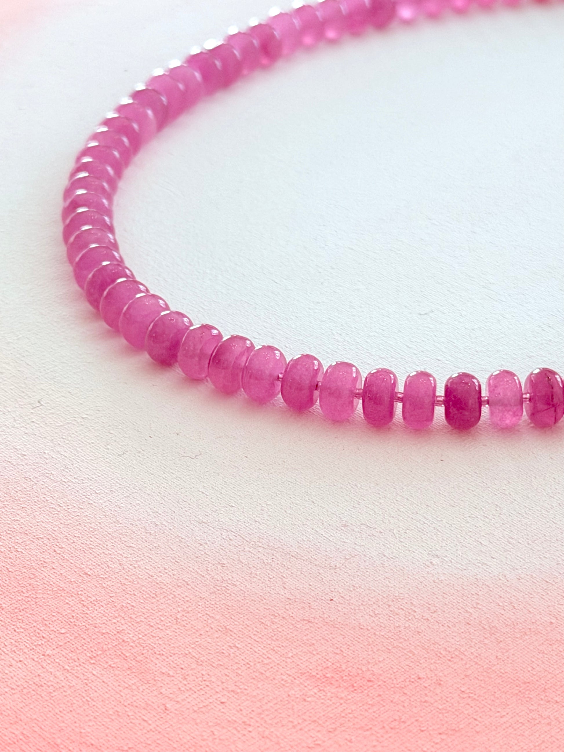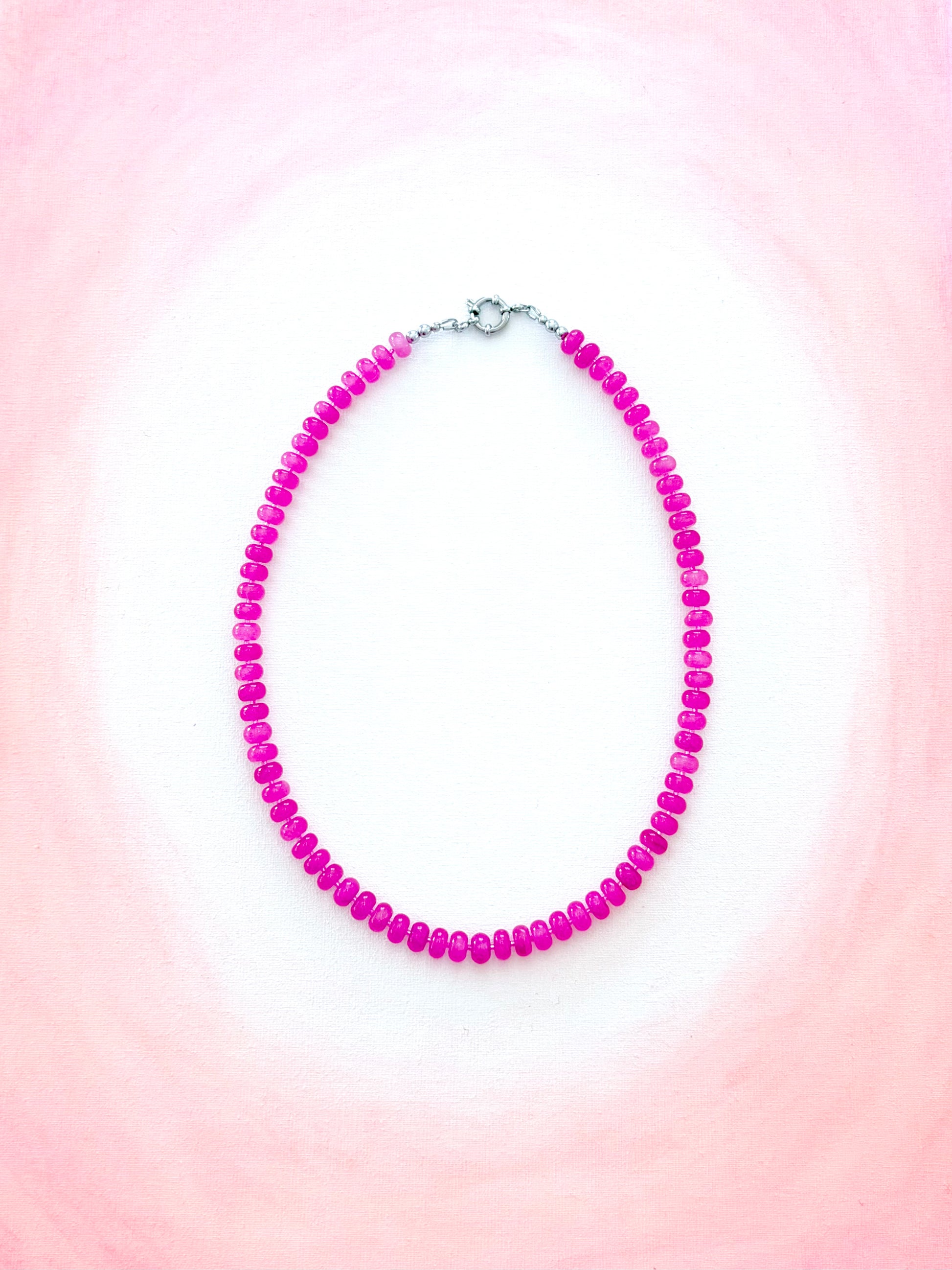 This shockingly hot pink dragonfruit punch doesn't need spiking to get your spirits high. It's the sweet & sour candy necklace meant for one of my sisters but I changed my mind at the last minute. Oops! Charm clasp means lots of fun friends can join this party ... or you can mullet it and spin the party to the back. Smooth jade rondelles with silver lined pink glass spacers.