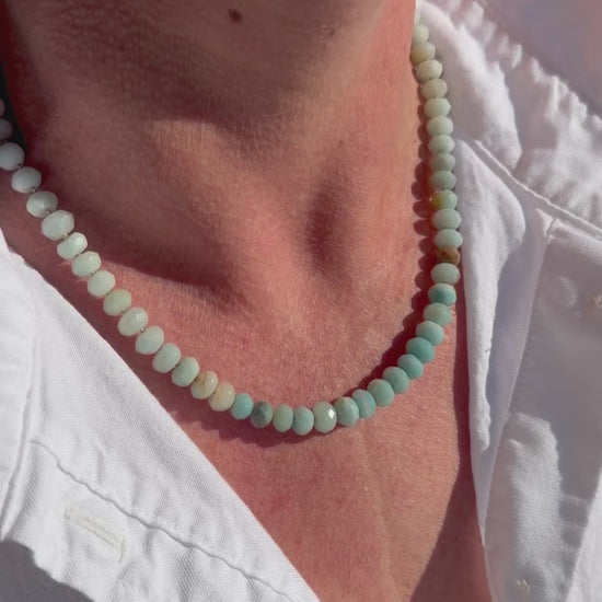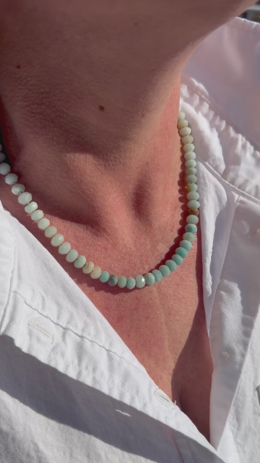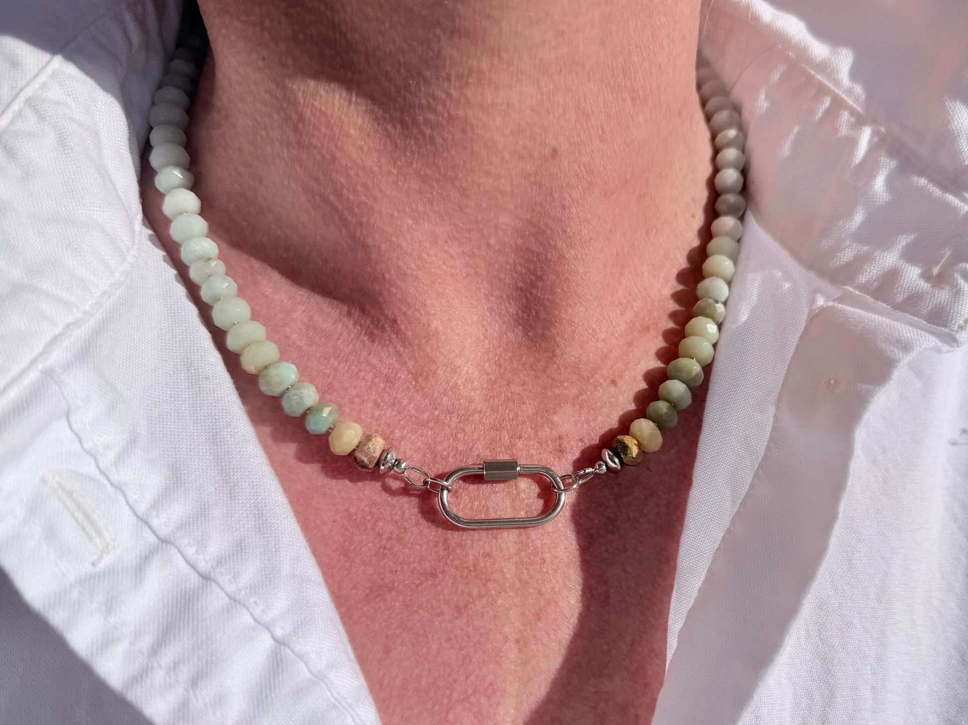 Gradient faceted Amazonite rondelles progress from bark brown through sea foam green and onto the most stunning aqua - set off with tiny silvery spacers, stainless steel carabiner clasp & findings. Can be worn with your favorite charms or with the clasp flipped to the back, which features the deepest aqua stones perfectly. Simple, tasteful ombre of a stone known for good vibes & hope.