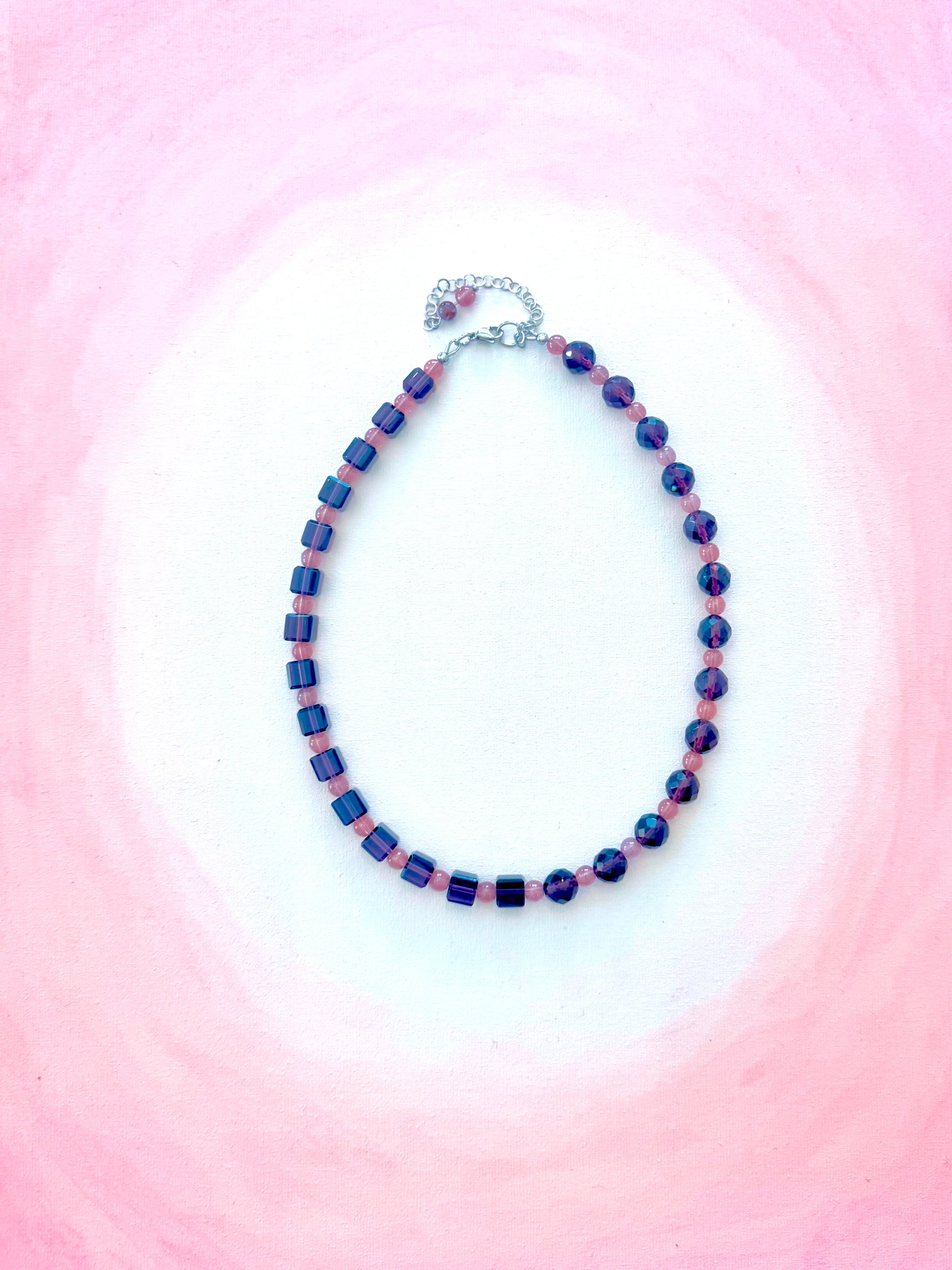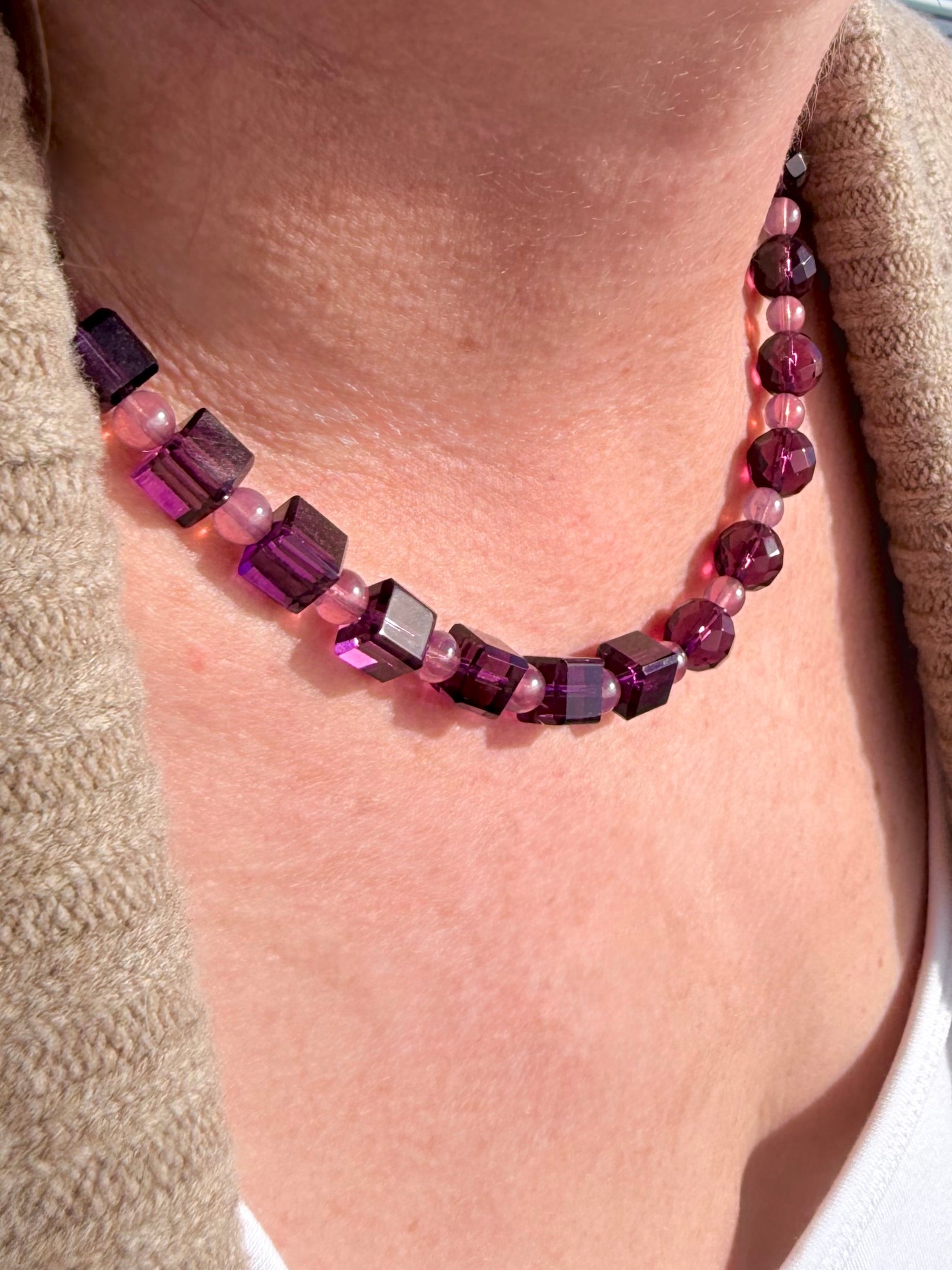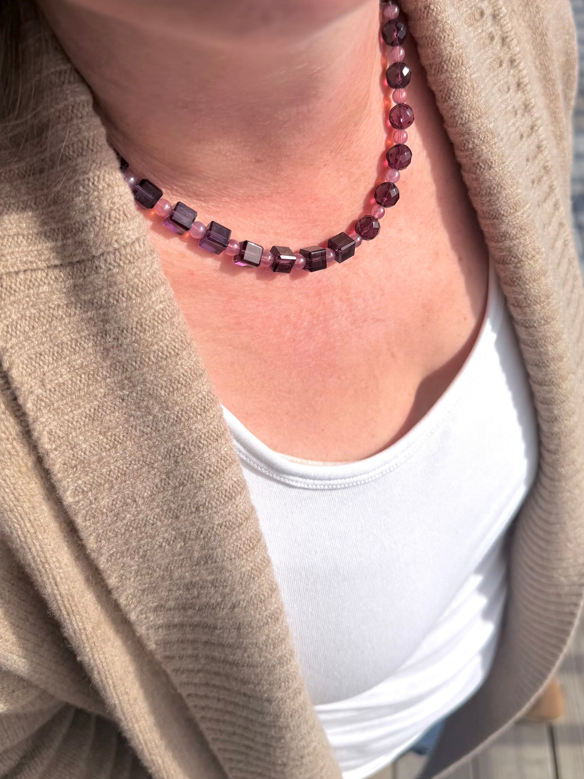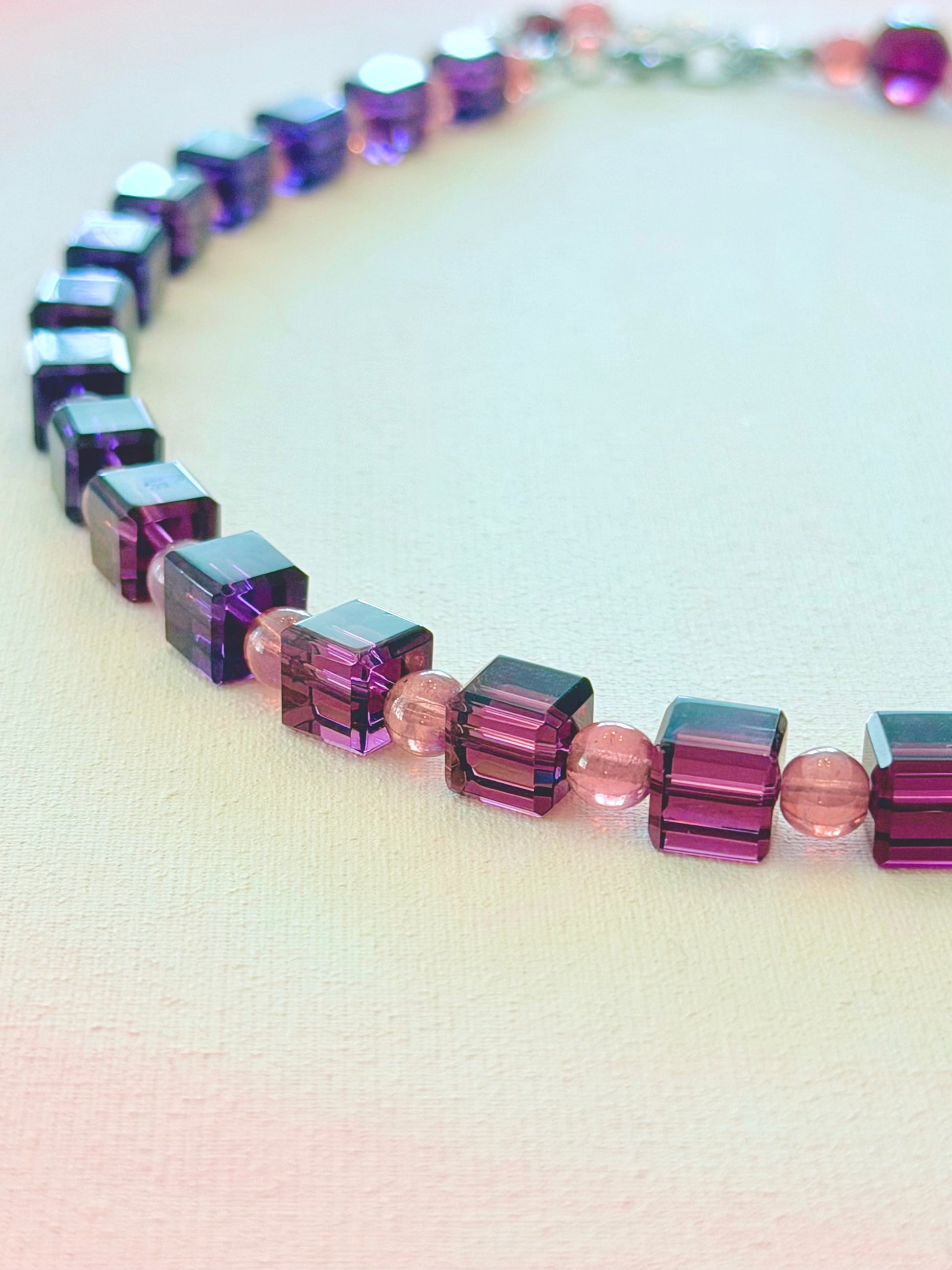 Moody and captivating, this one-of-a-kind strand is a concert of contrasts. The interior and exterior hues of ripe plums. Angular faceted cubes and soft faceted rounds. Deep, intriquing darks and clear, effervescent lights.