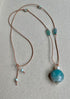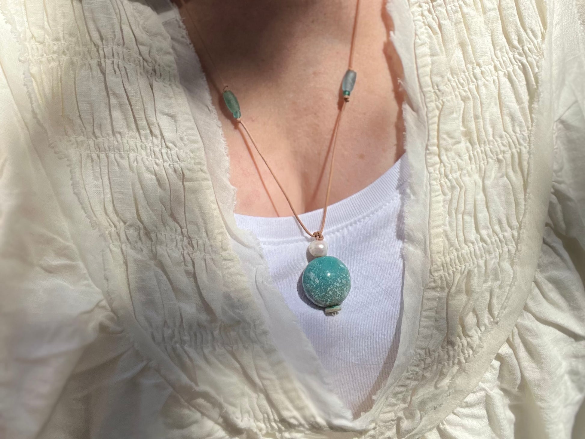 Have the whole world in your hand when you grab this globe-esque natural stone, freshwater pearl, conch shell and ancient roman glass piece knotted on tan leather.