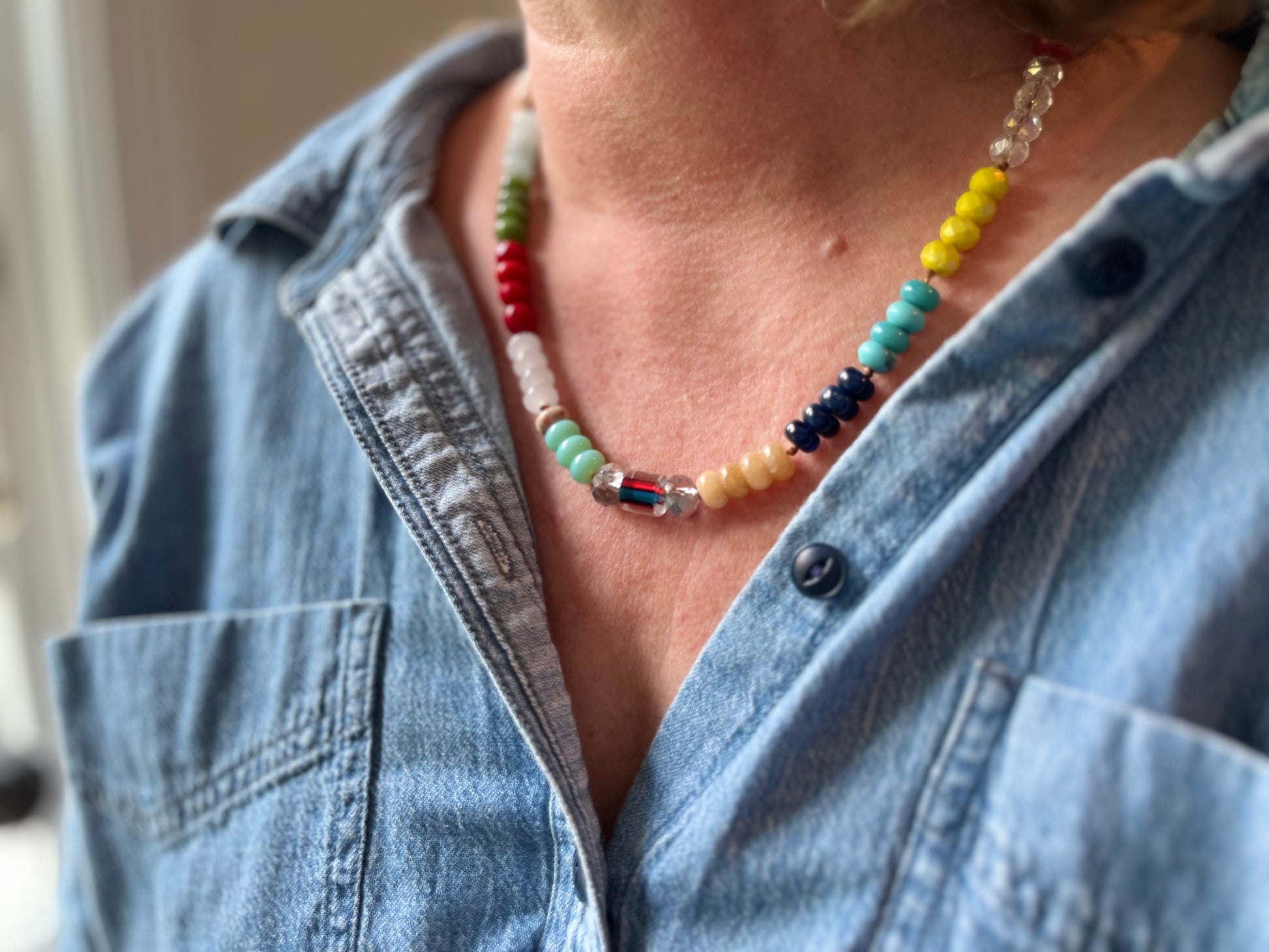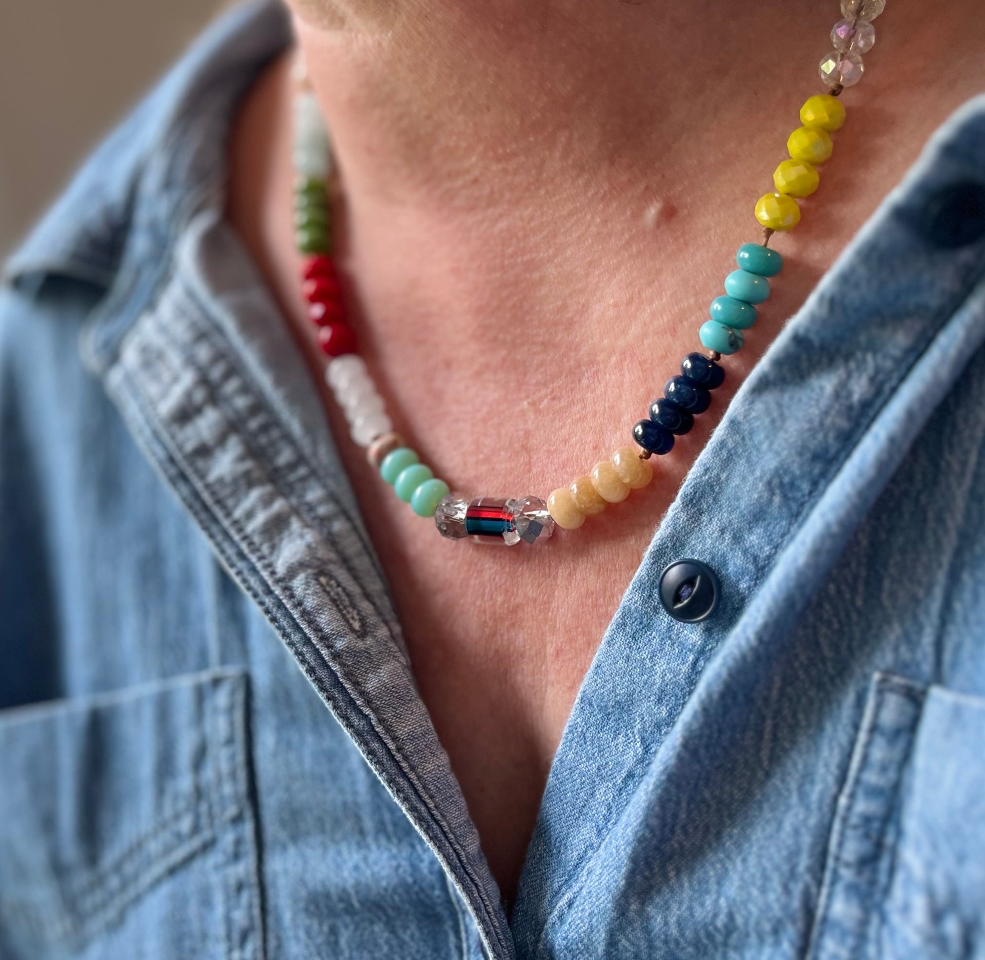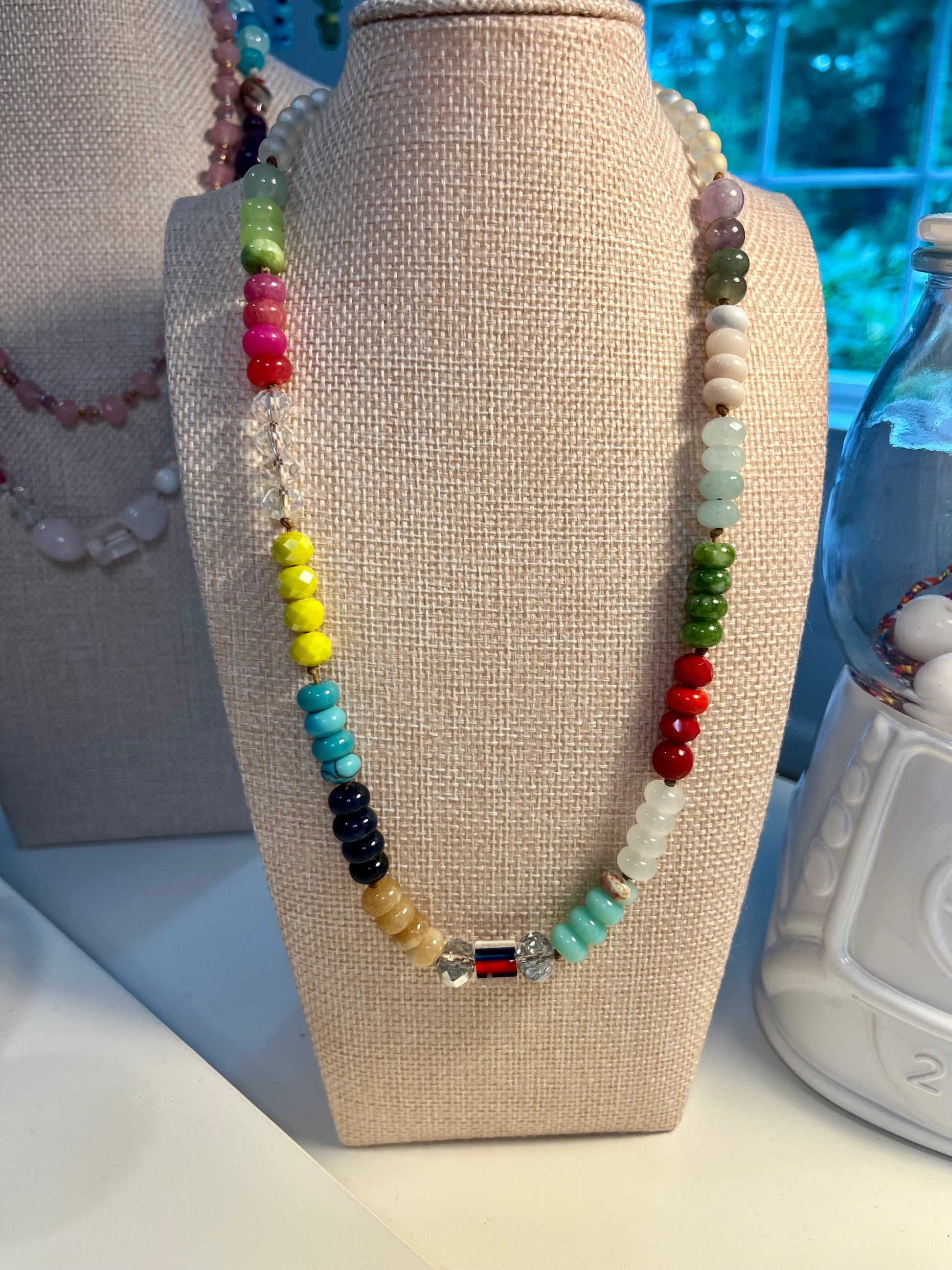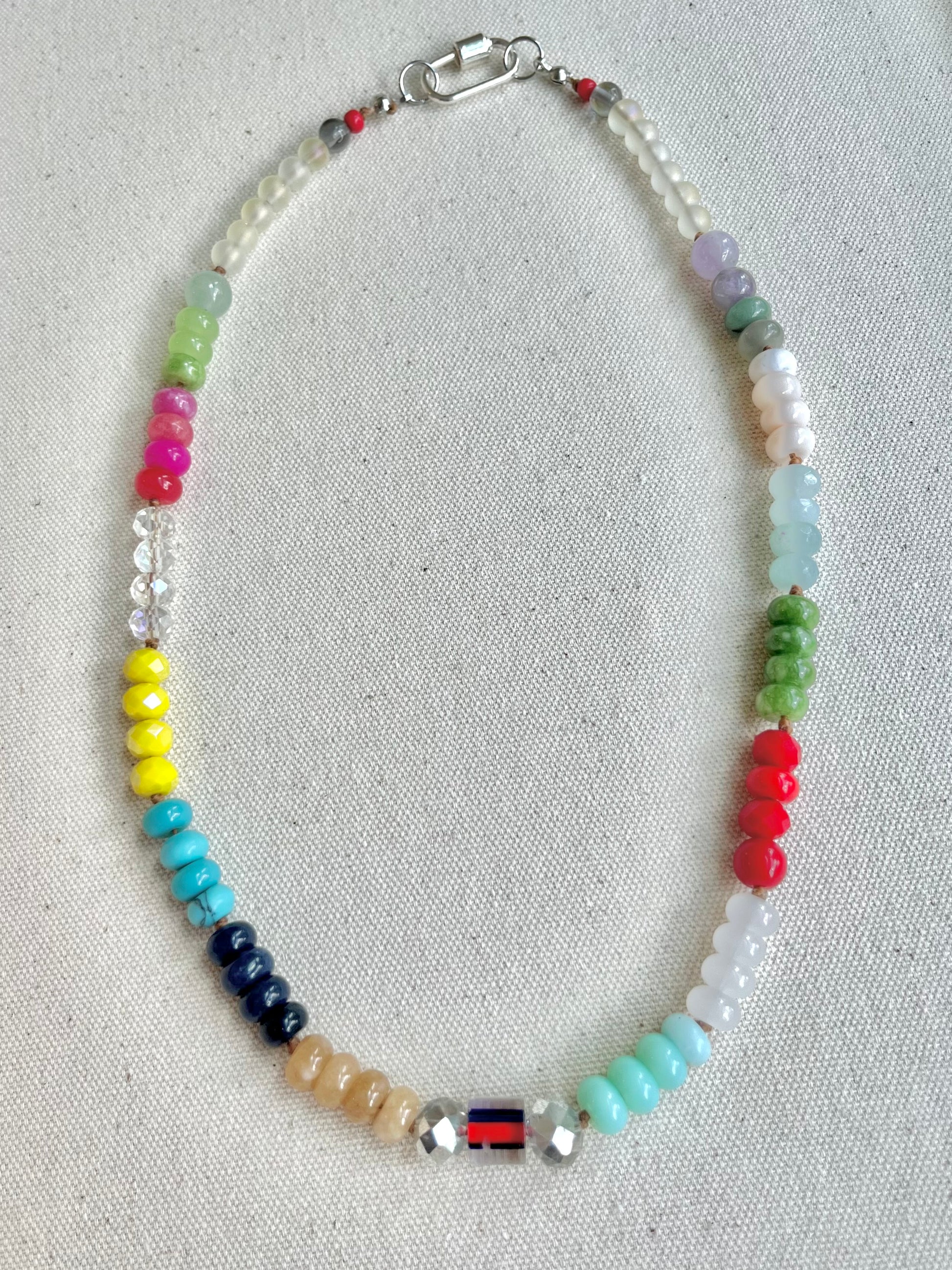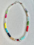 Colorfully chaotic one-of-a-kind fruit punch to the throat. Jade rondelles, glass crystals, frosted glass, trippy vintage lucite and faceted neon yellow beads fight it out on a hand-knotted brown silk with a carabiner clasp.