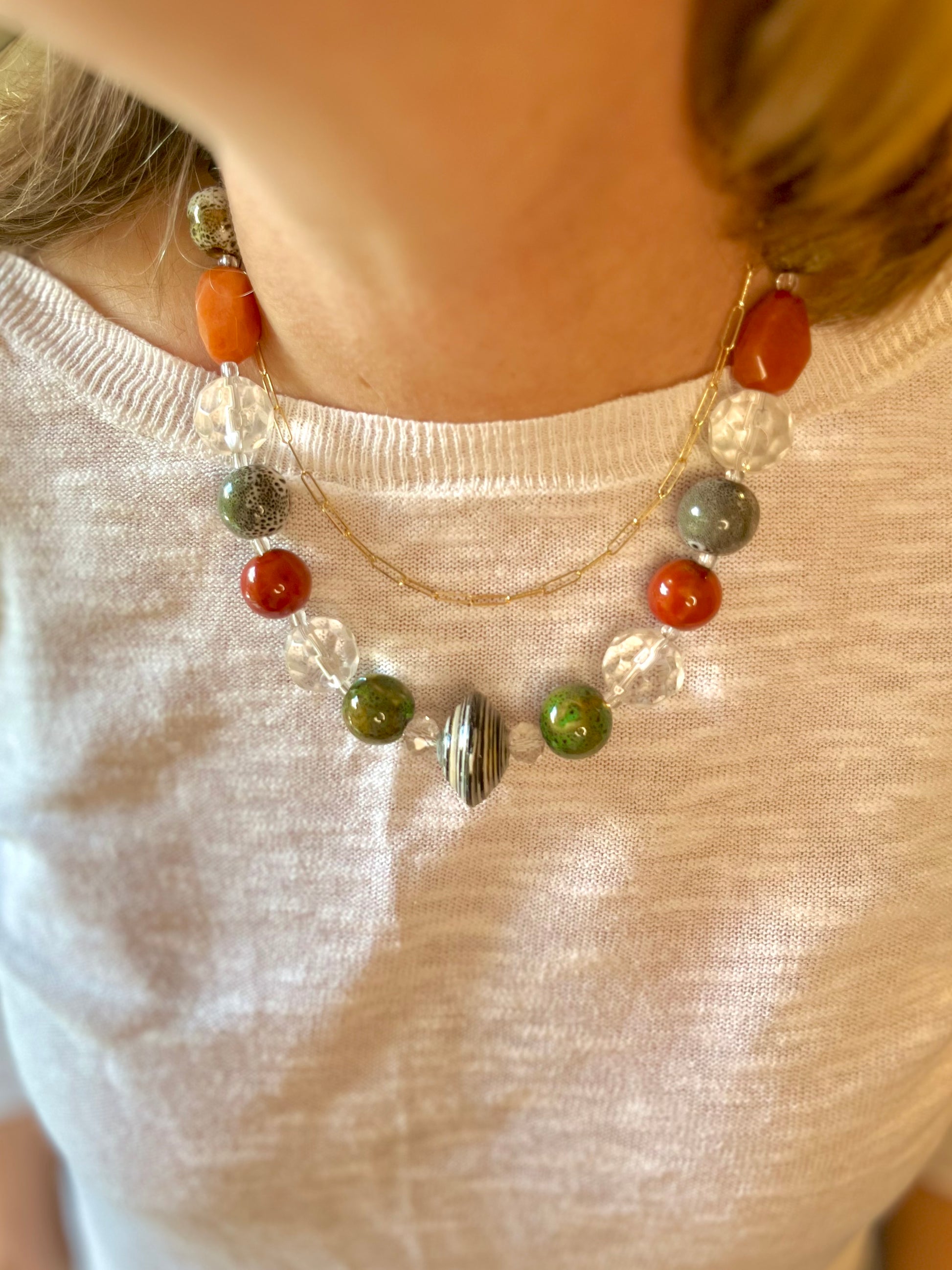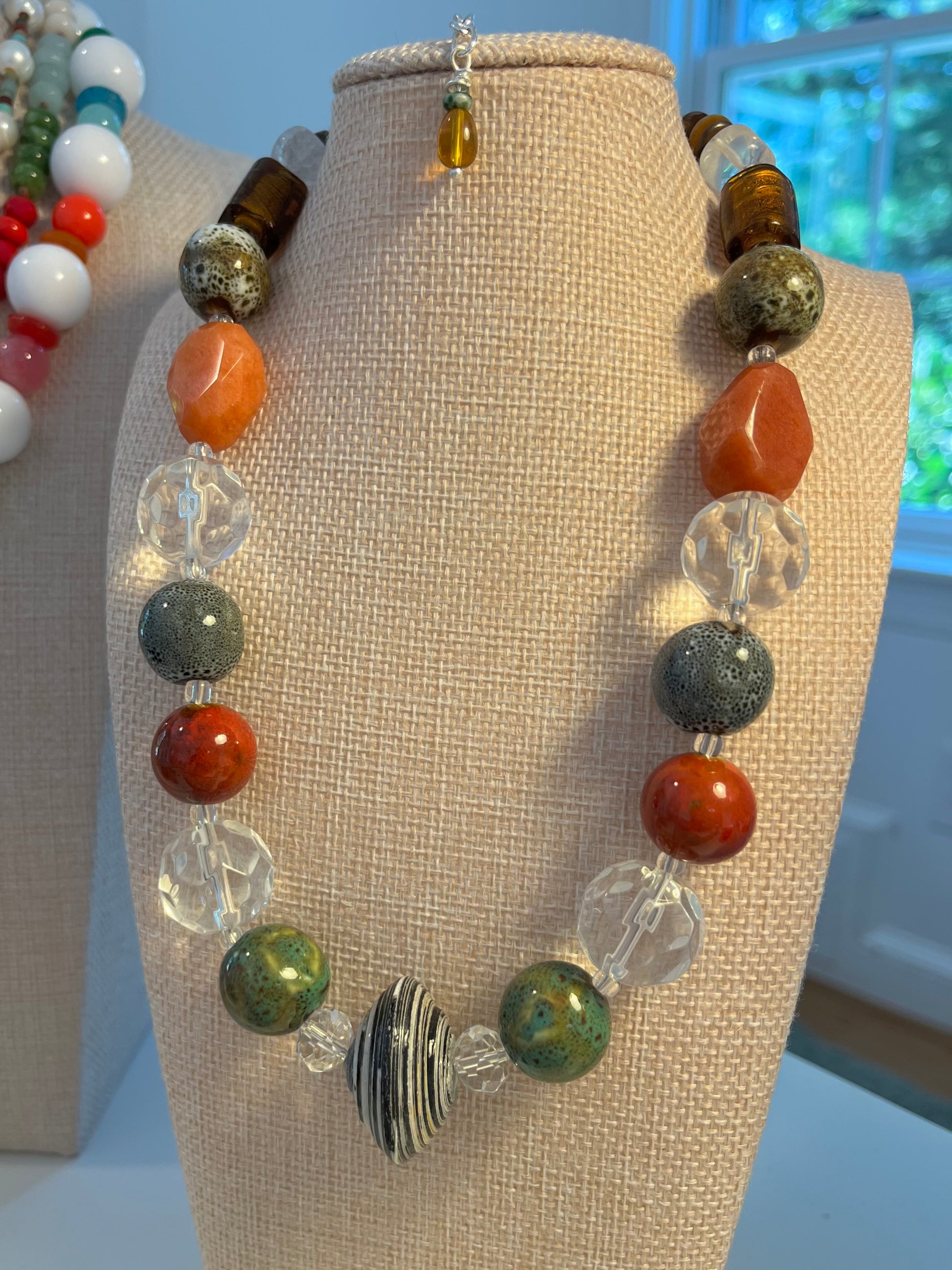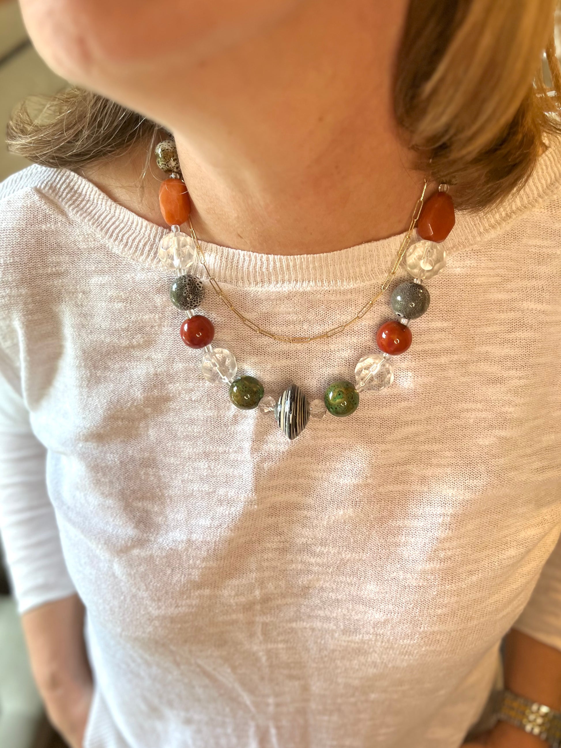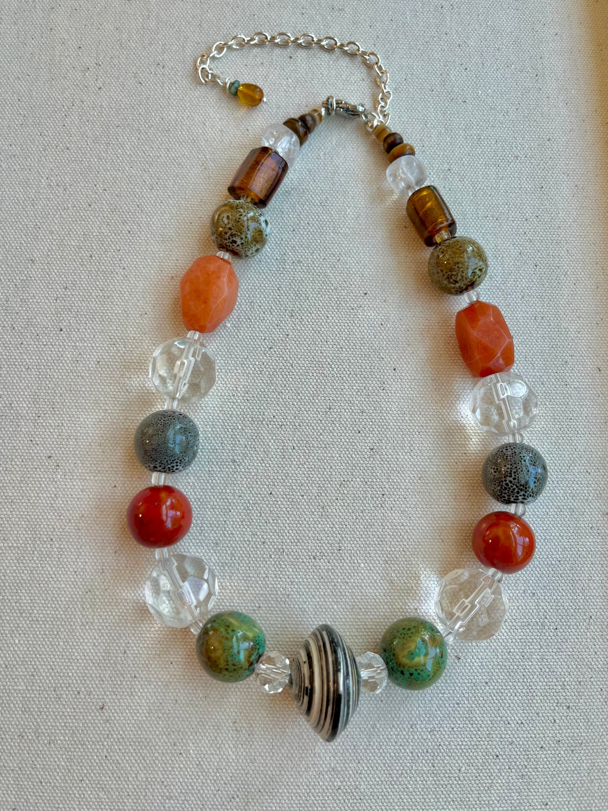To be honest with you ... I don't know what happened here. Ceramic, foiled glass, disco glass, vintage recycled newspaper bead, and a bunch of other random stones and shell and crystals. These disparate elements were magnetically drawn together like a Ouiji board spelling out "DANGER".