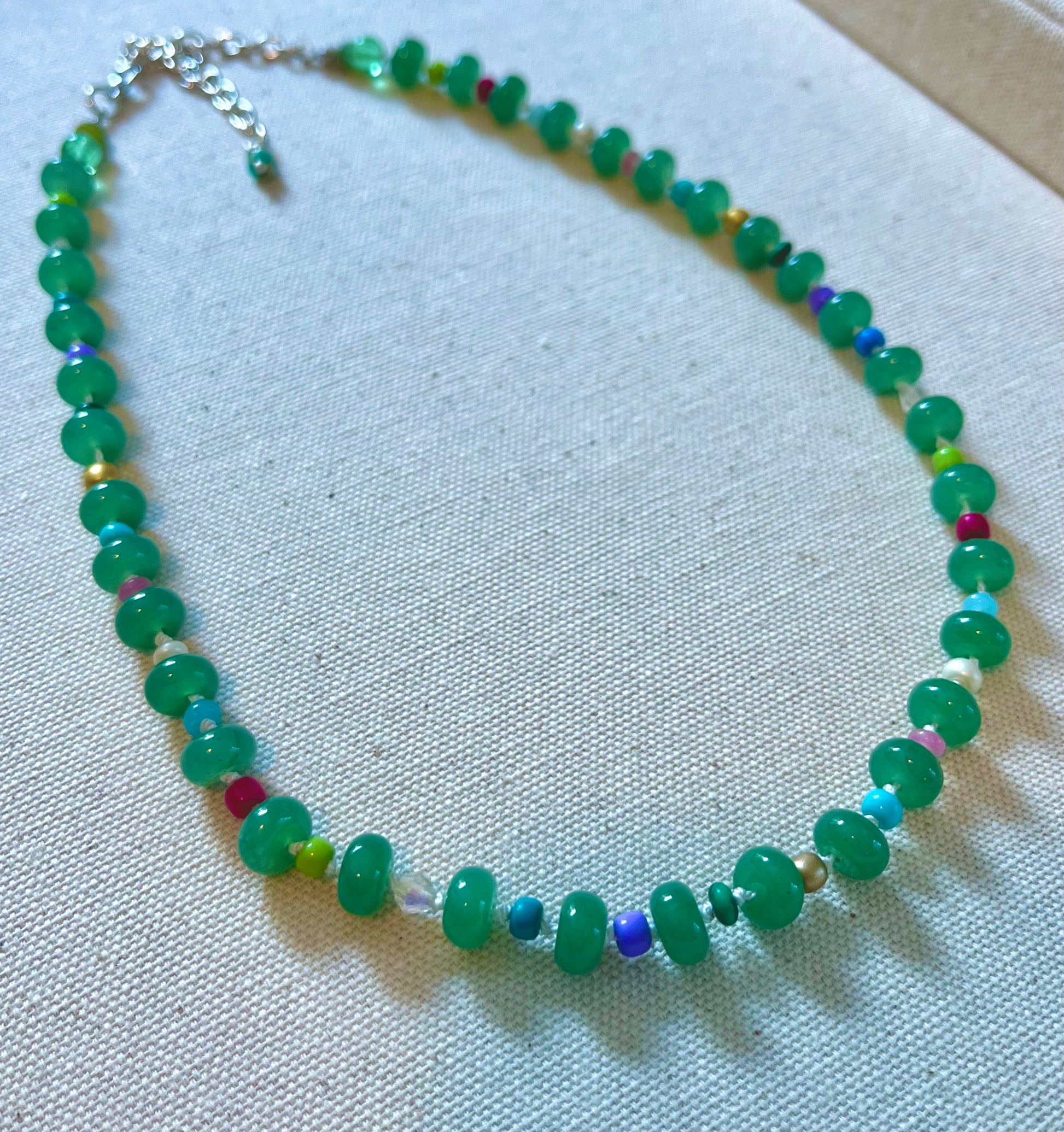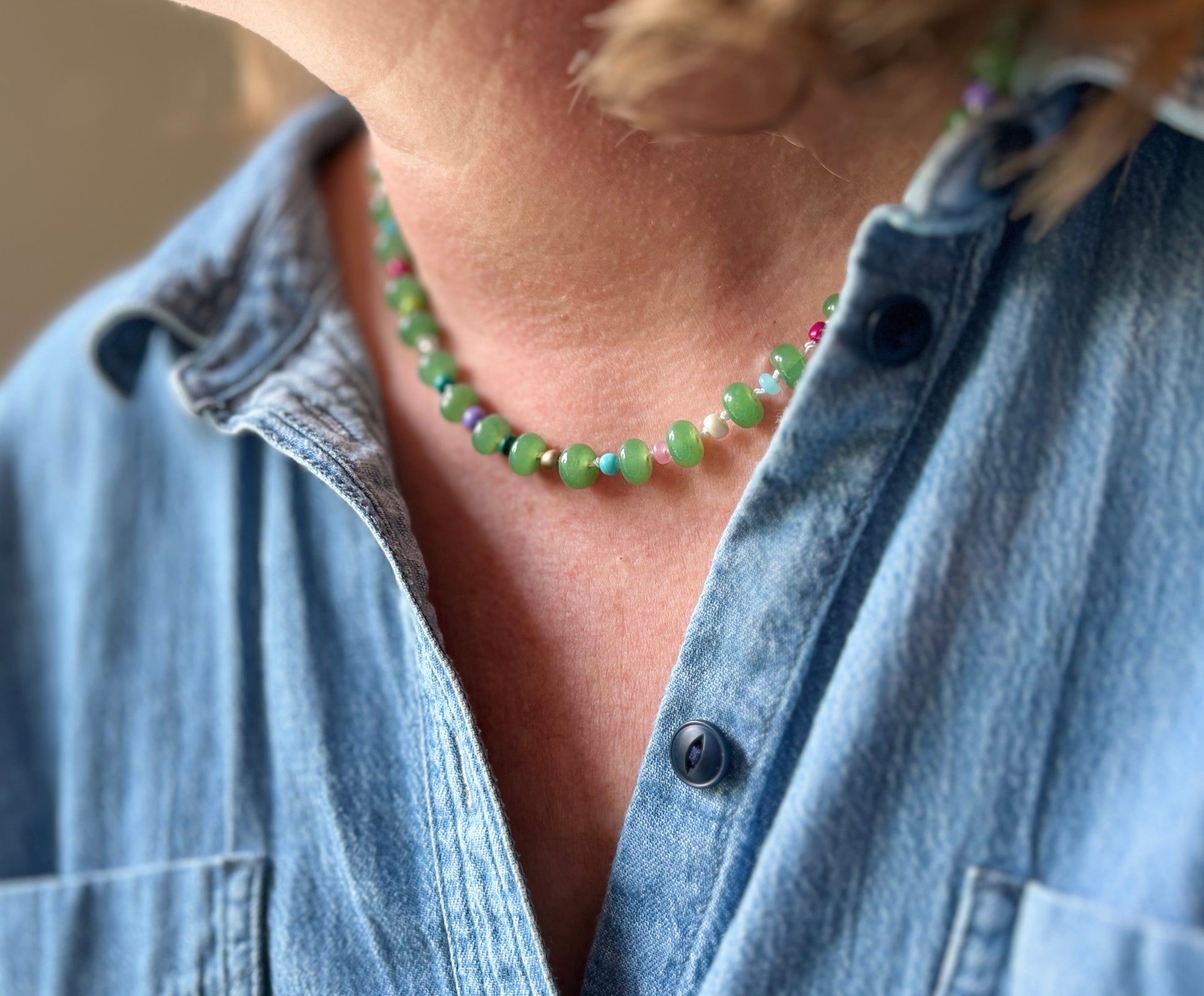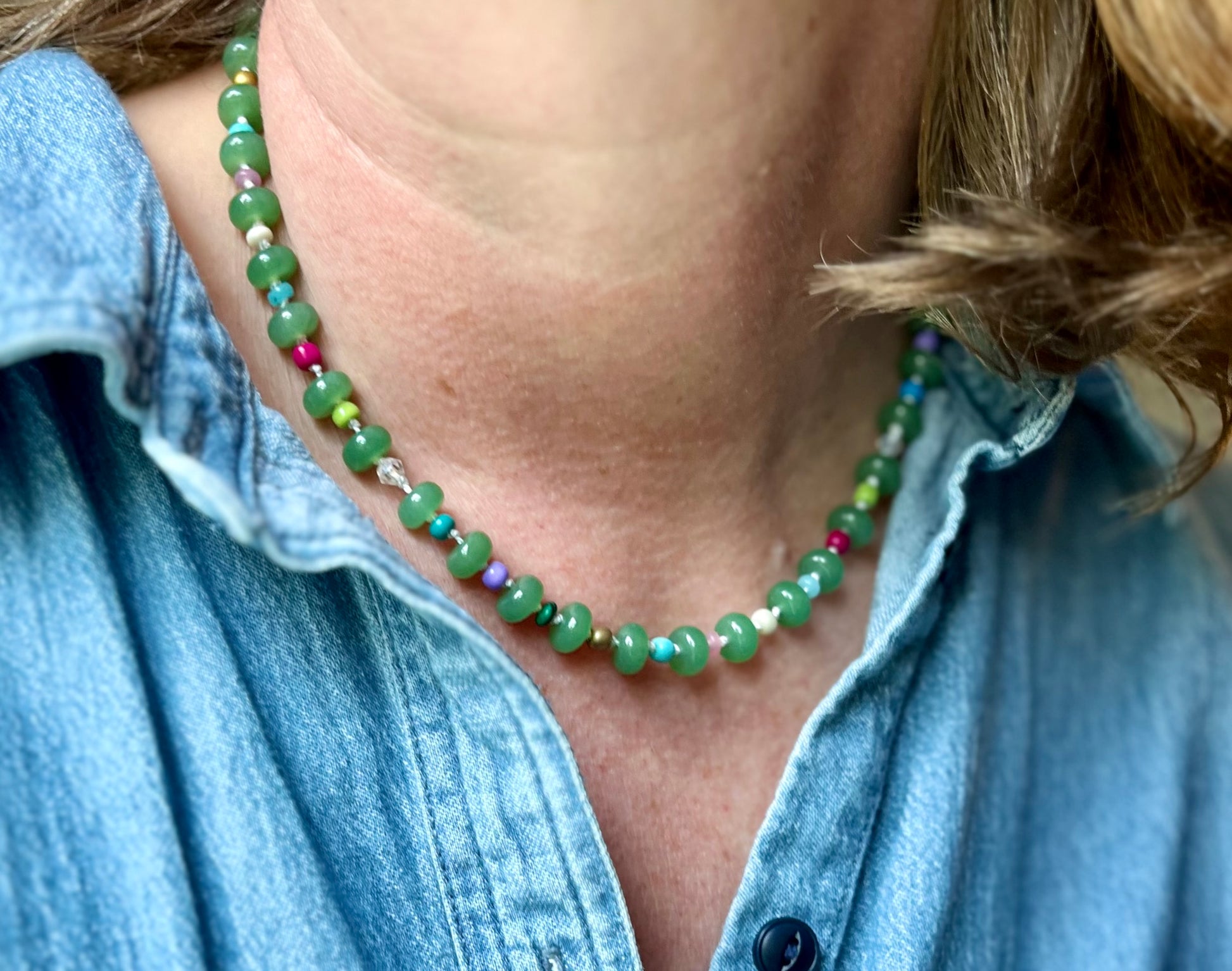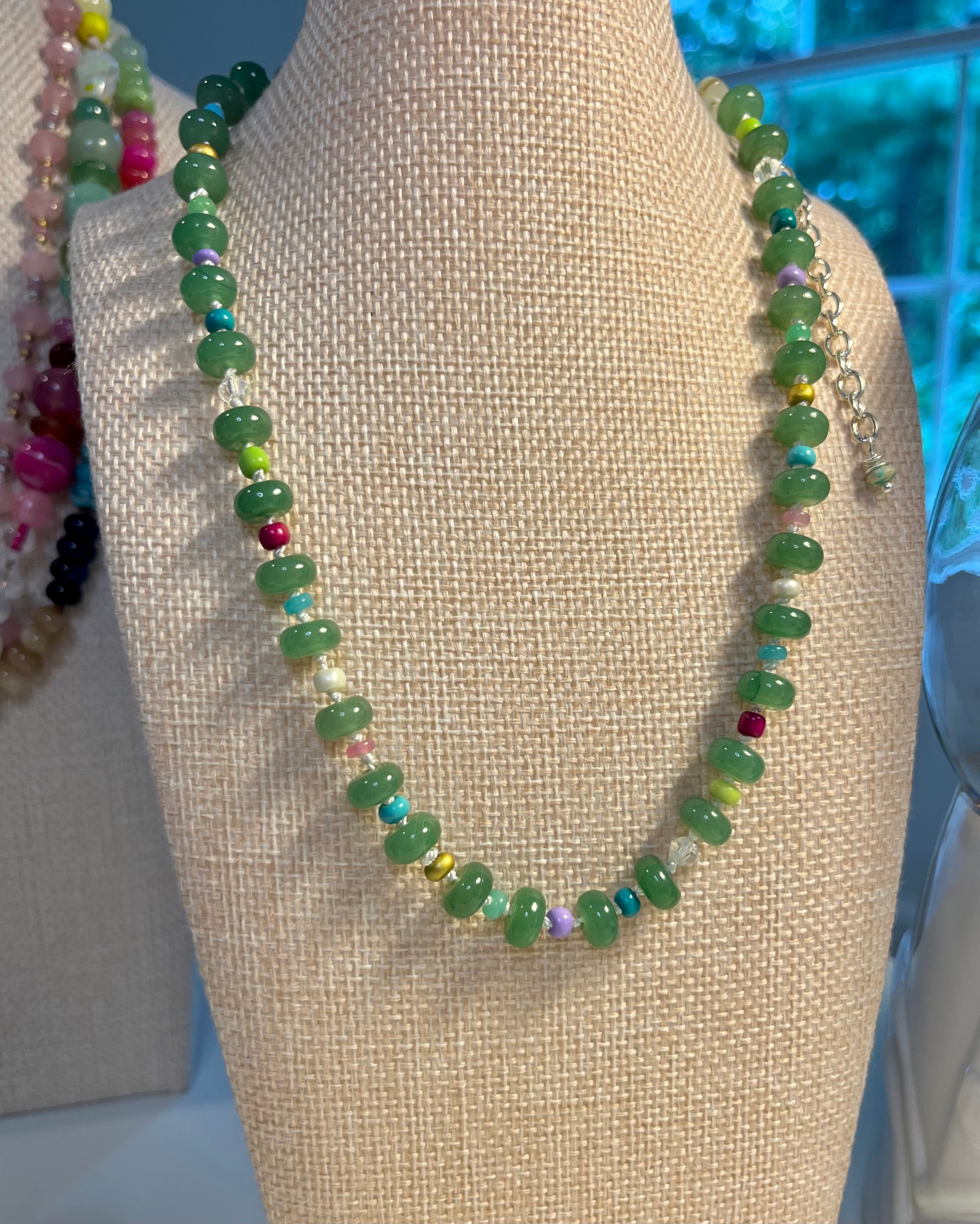 Candy necklace lite! Infinitely wearable jade candy style necklace lightened and brightened with a sprinkling of mini natural stones, glass crystals and seed beads in juicy colors/matte metallics hand knotted on white silk.