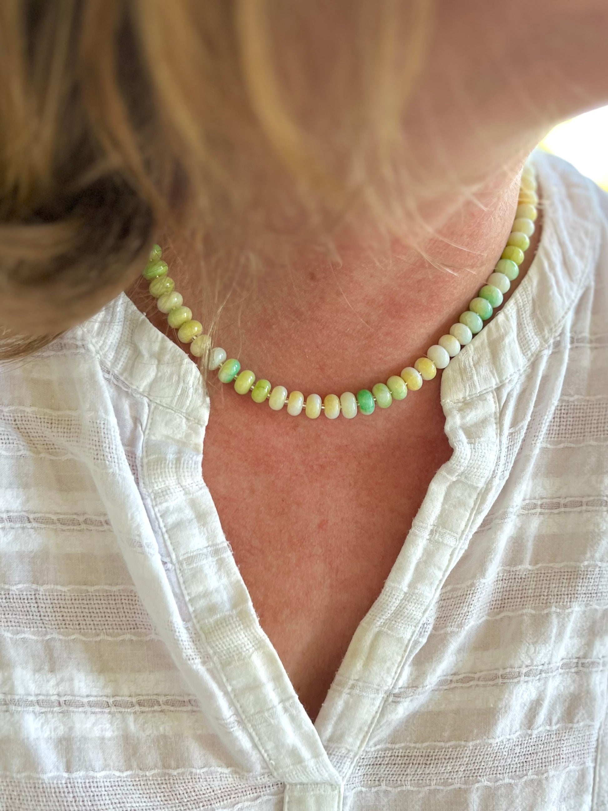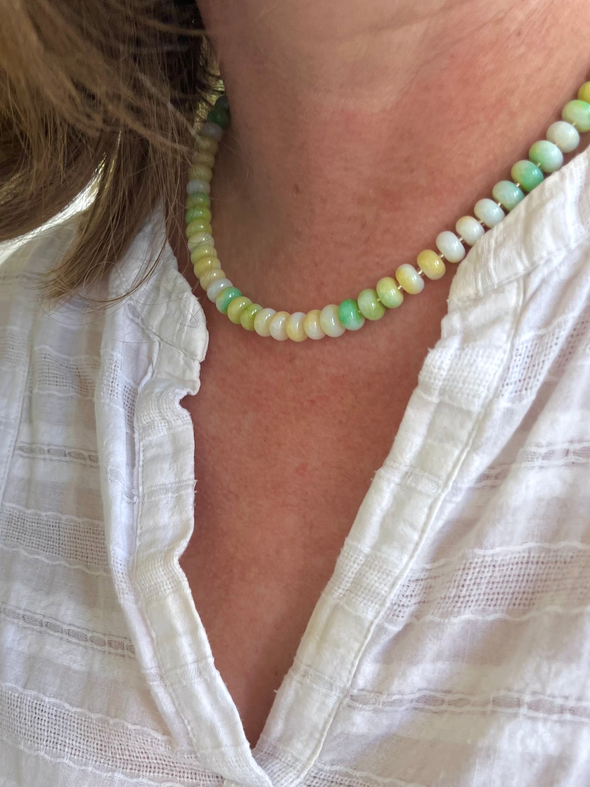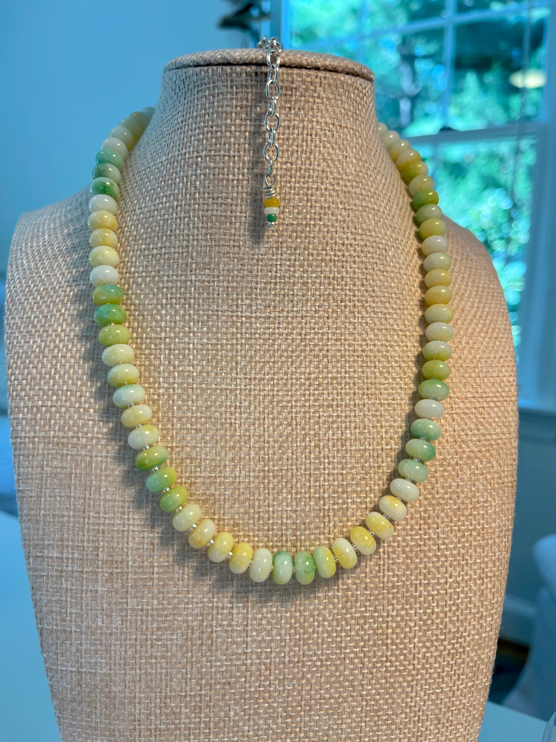 This citrus-iffic jade rondelle strand is 17 inches with a 4 inch extender for a total of 22 inches.